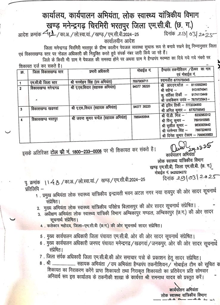 एमसीबी जिला स्तर पर मनमोहन सिंह (उप अभियंता) 7697909711, श्यामजीत हैण्ड पम्प मैकेनिक 8770759545, विकासखण्ड स्तर पर मनेंद्रगढ़ एएस सिदार (सहायक अभियंता)