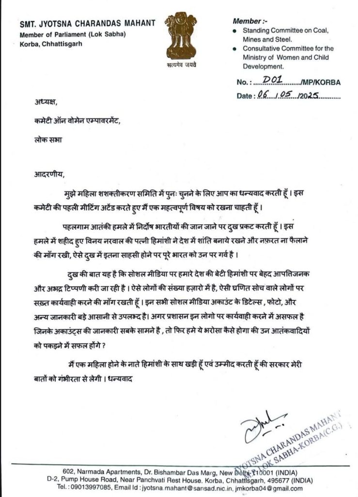 मनेन्द्रगढ़। छत्तीसगढ़ की कोरबा से सांसद ज्योत्सना महंत ने महिला सशक्तिकरण समिति को पत्र लिखकर एक गंभीर मुद्दा उठाया है। उन्होंने पहलगाम आतंकी हमले में शहीद विनय नरवाल की पत्नी हिमांशी के खिलाफ सोशल मीडिया पर की जा रही आपत्तिजनक टिप्पणियों पर चिंता जताई है।