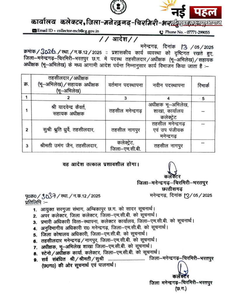 मनेन्द्रगढ़-चिरमिरी-भरतपुर। जिले में कलेक्टर डी राहुल वेंकट ने प्रशासनिक कार्य व्यवस्था के तहत तहसीलदारों के पदस्थापना में बदलाव किया है। कलेक्ट्रेट कार्यालय से जारी आदेश के अनुसार, नागपुर तहसीलदार सुश्री श्रुति धुर्वे को मनेन्द्रगढ़ जिला मुख्यालय का नया तहसीलदार नियुक्त किया गया है।