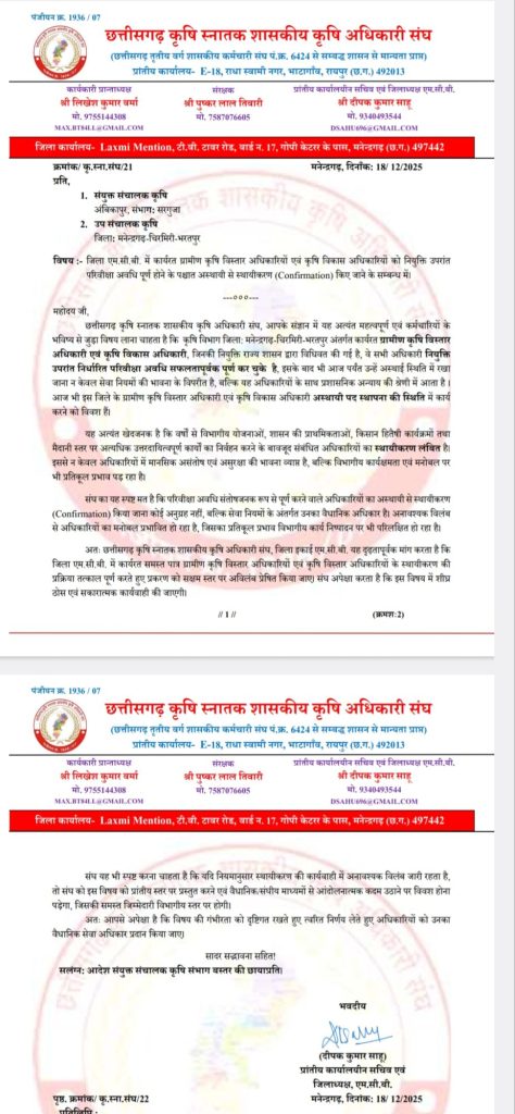 जिला अध्यक्ष दीपक कुमार साहू ने कहा कि जिले के कृषि अधिकारी शासन की महत्वाकांक्षी योजनाओं और किसान हितैषी कार्यक्रमों को जमीन पर उतारने के लिए दिन-रात समर्पण भाव से कार्य कर रहे हैं। इसके बावजूद, स्थायीकरण की प्रक्रिया में हो रही देरी से अधिकारियों के मनोबल पर विपरीत असर पड़ रहा है।