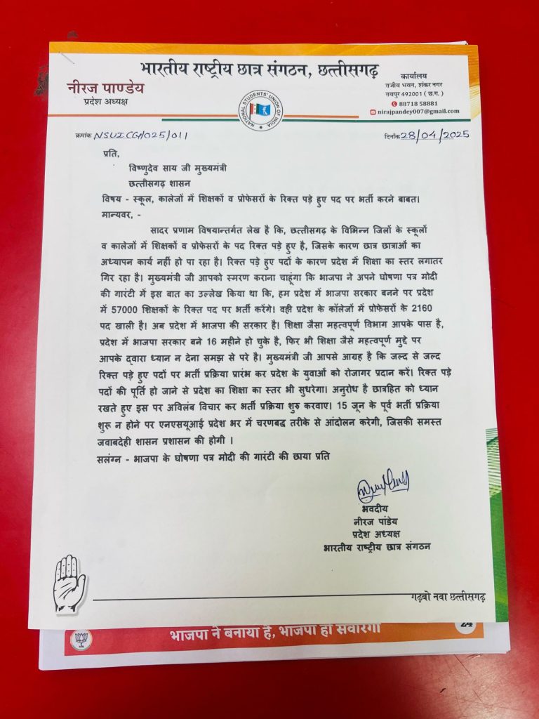 छत्तीसगढ़ में शिक्षा व्यवस्था को लेकर एनएसयूआई ने मुख्यमंत्री विष्णुदेव साय को पत्र लिखा है। एनएसयूआई प्रदेश अध्यक्ष नीरज पांडेय ने पत्र में कहा कि प्रदेश के स्कूलों में 57,000 शिक्षकों और कॉलेजों में 2,160 प्रोफेसरों के पद खाली हैं।